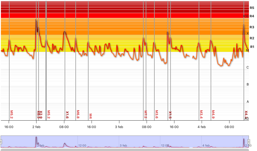 Om te beginnen blijven de zonnevlammen maar doorgaan. Ik heb nog niet eerder zo’n lange aaneensluitende tijd zonnevlammen meegemaakt. Ik weet dat het invloed op ons mensen kan hebben en het schijnt ons licht voor accentie en DNA-updates te geven.. Alleen al de laatste 3 dagen (geel=M-vlammen, oranje + X-vlammen):